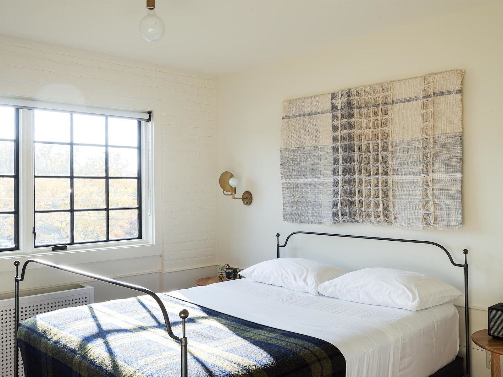 Naturally, I was curious to learn about the Lodge itself. Lynch recalls that “It used to be a motel — it had a very seedy past — first it was a movie theater.” Mahoney adds, “then it was a Chinese restaurant.” Lynch elaborates: “It was a squatting house for a second.” Ray Pirkle and Kim Bucci — the lodge owners — originally came to Workstead about redesigning the space into the Rivertown Lodge after seeing the house that Workstead partners Highsmith and Brechbuehler renovated for themselves. Mahoney shows me a picture of the delightfully modest home among the trees. “They bought it, and it was covered up with asbestos materials. But luckily all these materials protected what was underneath, so they ripped everything up and finished it. This was published on a blog and the clients saw it.” You can see the traces of this initial inspiration throughout the Rivertown Lodge, which Workstead designed from soup to nuts. I knew that Workstead created lighting collections out their projects, and the Lodge is a special example because they created every single light fixture for the whole hotel, and almost all of these are now available for purchase.