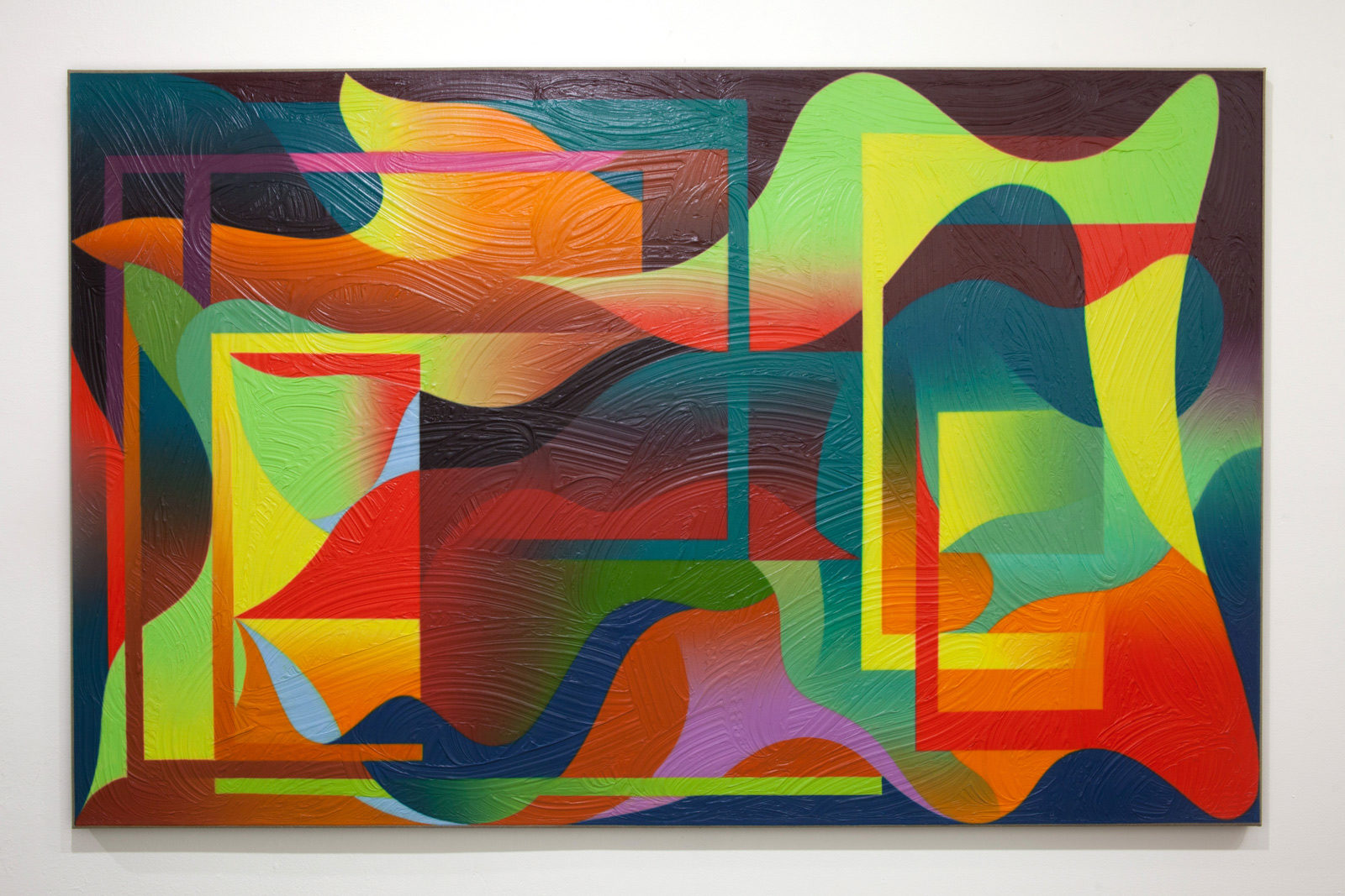 Mariah Dekkanga is a painter whose use of color does not begin with the materials she finds (as is the case with Pantazopoulou), but rather comes from a more conventional tradition of color theory. Her abstract paintings manage to achieve magnificently stable compositions while combining wave like shapes with rectangles and a multitude of overlapping colors. What is more, the wave shapes she paints exist in combination with contrapuntal waves of impasto. The effect is similar to watching a complex ballet executed effortlessly.